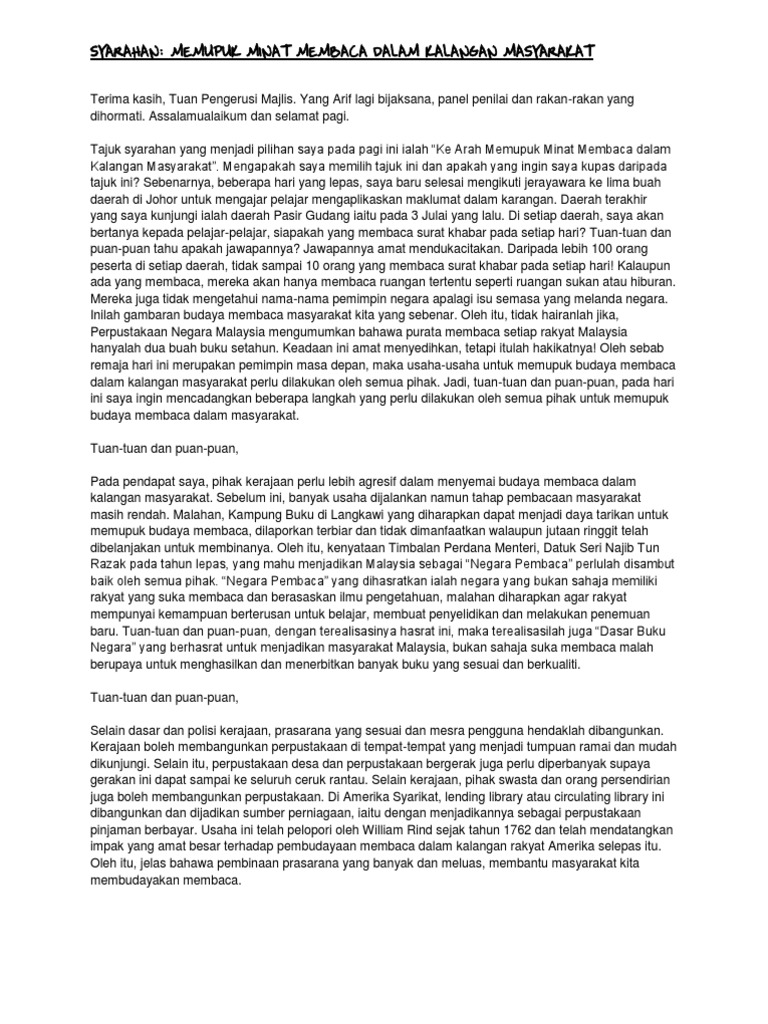 Sewajarnya masyarakat rajin berusaha dalam memupuk amalan membaca dan seterusnya menjayakan kempen-kempen yang telah dianjurkan oleh kerajaan tentang amalan membaca. Karangan SPM Ibu bapa memainkan peranan penting dalam memupuk minat bersukan dalam diri anak-anak. Perhimpunan ini dapat menanam semangat patriotik melalui nyanyian lagu Negaraku.